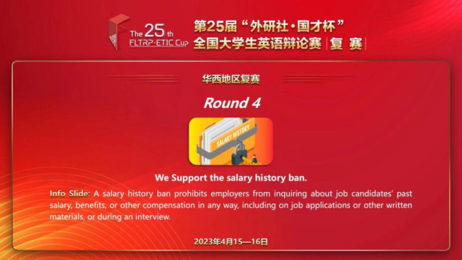 第四轮的辩题则抛出了一个职场问题:应聘者过往的薪资和福利待遇等是否应该对招聘者保持公开透明呢?薪资历史往往能代表应聘者寻求job hopping(跳槽)时对薪资期待的一个底线,而招聘者也往往会参考薪资历史来与应聘者谈判新的待遇问题。该题要求辩手从多个stakeholder(利益相关者)的角度来分析利弊,鉴于本科大学生对求职时的利益博弈较为陌生,该题存在较大难度,但不失为引起大学生辩手们进一步理解职场文化的契机。