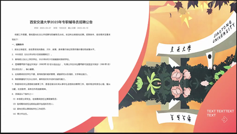 、西北大学和陕西师范大学辅导员招聘公告为例,介绍了其中应该注意的关键点。学姐提到,可通过四大渠道全方面收集信息:第一是各大学校官网;第二是各省人力资源和社会保障厅官网;第三是辅导员招聘微信公众号;第四是心仪地区高校就业中心、外语类高校就业中心。接着,学姐介绍了笔试面试基本内容和考试题型,并建议笔试面试应同时准备,并且注重日积月累,语言表达能力不是一日之功,应提前练习提升。