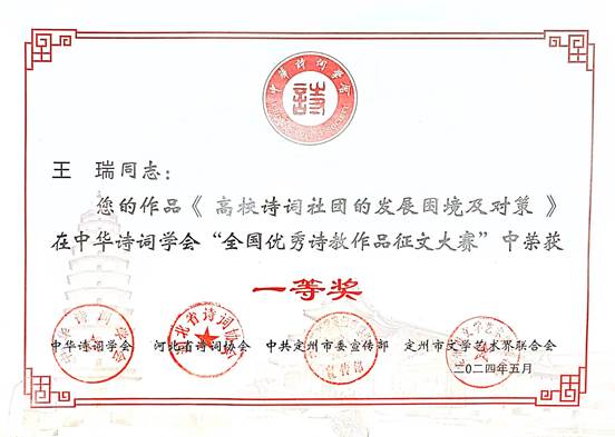 今年5月17日至19日,由中华诗词学会主办的“全国诗教工作(定州)会议”在河北定州召开。中华诗词学会领导、定州市委书记、定州市宣传部长、各省市诗词学会负责人以及全国优秀诗教论文获奖作者代表共计130余人出席会议。会议颁发了优秀诗教论文征集的荣誉奖项。