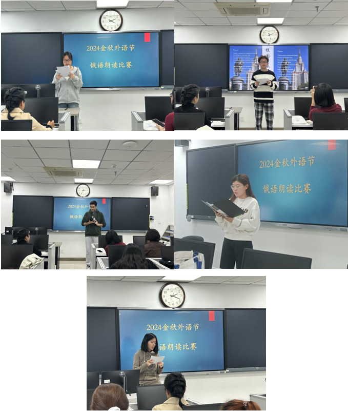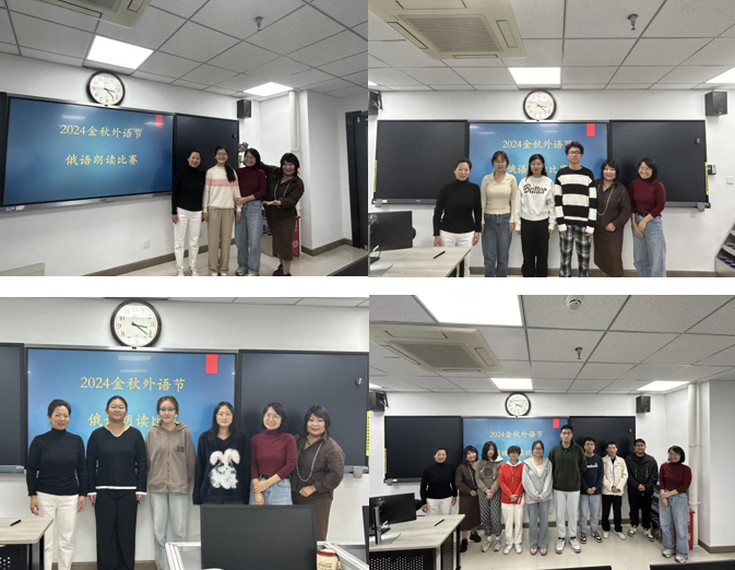 2024年10月30日下午,第22届金秋外语节朗读大赛在外文楼B508成功举办。此次参赛的同学不仅有来自英俄 2201 班的同学,还有人文学院对俄语满怀热忱的同学。所有同学在赛前积极准备,在比赛中均大放异彩,淋漓尽致地展现出扎实的俄语功底和浓烈的俄语兴趣。