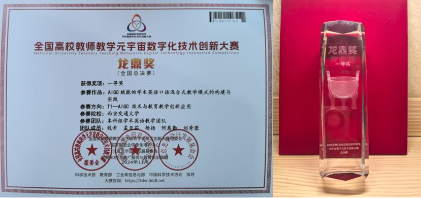 的支持下,特别关注信息技术与教育教学的深度融合与创新,积极探索教育数字化转型背景下的教学模式改革。团队开设的“通用学术英语”“雅思口语”等课程先后获评“国家级一流本科在线课程”、“陕西省一流本科线下课程”、“陕西高校疫情期间本科在线教学典型案例”等。今年10月,团队率先推出了陕西省首门数字人慕课--“学术英语口语基础”并建成了AI全流程赋能的智课;11月,团队教师在负责人钱希的带领下获得了“第5届全国高校教师教学元宇宙数字化技术创新大赛总决赛”(AIGC赛道)一等奖,并捧得最高奖“龙鼎奖”。此次申报案例入选“在线开放课程/MOOC教学”优秀案例再次彰显了该教学团队在智慧教学改革与探索路上的示范和引领。
