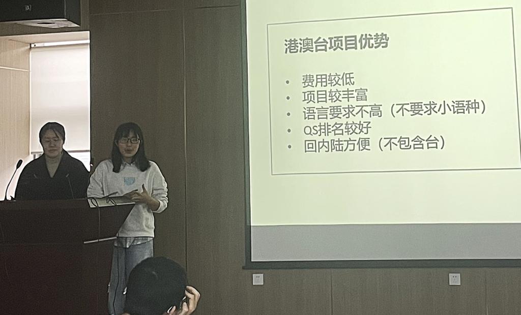 田月荷和齐书雯同学分享了在香港城市大学的交流经验,介绍了课程情况与申请时的注意事项。田月荷重点讲述了在体验中学习的重要性,并分享了她在交换期间通过放慢节奏、深入思考所获得的宝贵收获。齐书雯则分享了自己通过参加校园活动逐步突破自我,在个性发展和跨文化理解能力上取得的进步。