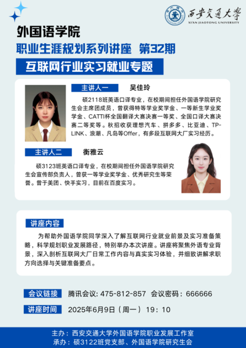 于2025年6月9日晚19:10举行生涯规划系列讲座第三十二期之互联网实习就业专题分享活动,特别邀请吴佳玲、衡雅云讲解求职方向选择与关键准备要点。本次活动由黑料网