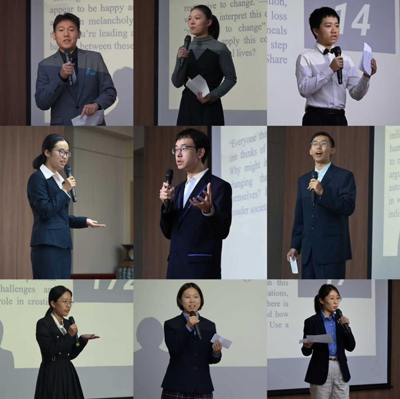 Jack Dudley、刘睿、吉乐、楚建伟、邹郝晶、张静洁等六位老师共同组成,钱希老师担任提问嘉宾。与往届相比,本次决赛赛制全面升级,采用更具挑战性的即兴演讲形式,每位选手需在3分钟内完成演讲,并接受1分钟现场问答。在高度紧张的比赛氛围中,选手们需要在20分钟内,对随机抽取的题目进行快速构思与组织。题目内容涉猎广泛、立意深刻,既关注“中国的和平发展道路”“君子和而不同”等宏大命题,也聚焦“预制菜的文化映射”“网红经济”“内耗的根源”等社会热点,更有“人文学科的价值之争”“学科的交叉融合”等思辨性议题,全面考验选手的知识储备、思维深度与跨文化表达能力。