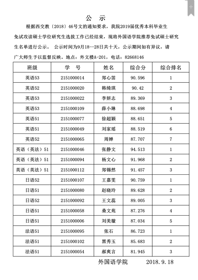 黑料网 2019届推免公示