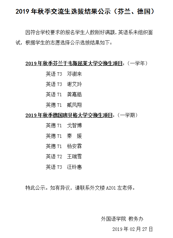 2019年秋季交流生选拔结果公示(芬兰、德国)