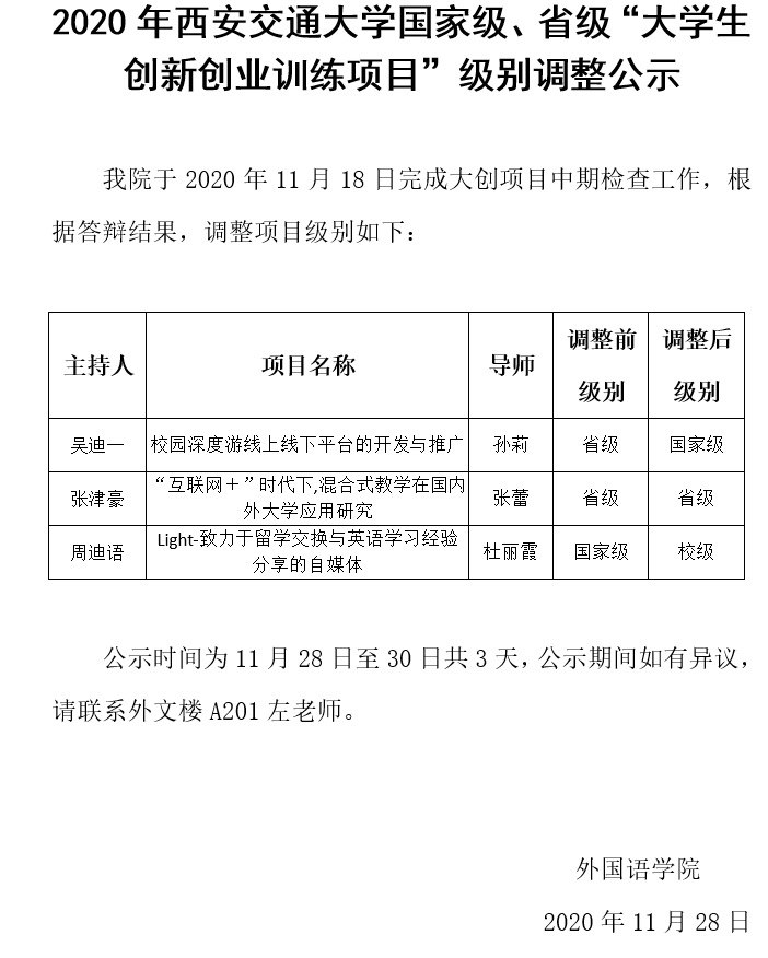2020年黑料网 国家级、省级“大学生创新创业训练项目”级别调整公示