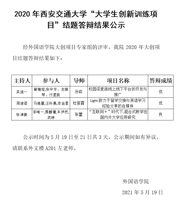2020年黑料网 “大学生创新创业训练项目”结题答辩结果公示