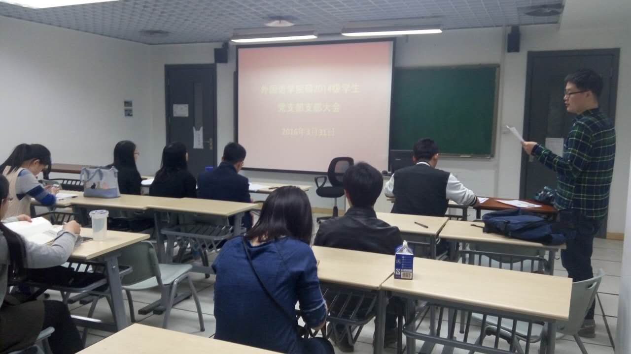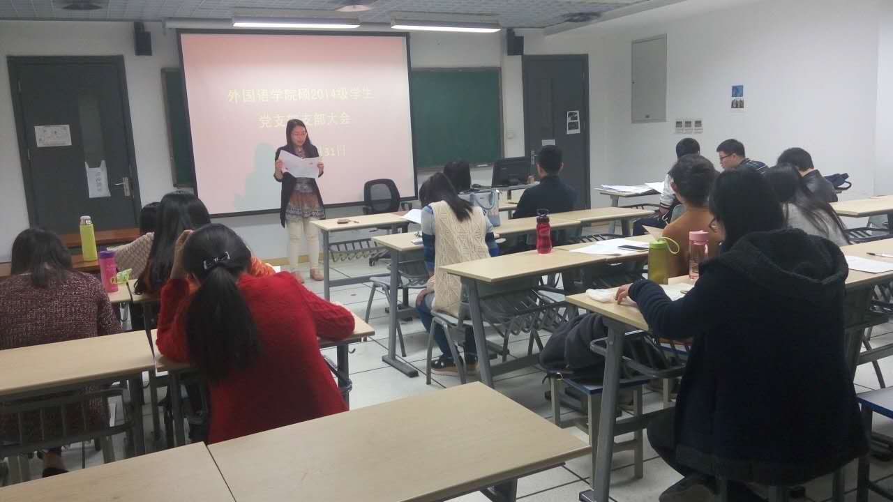 硕2014级党支部于外文楼A402教室召开支部大会,重点讨论发展对象谷肖东、祁玉玲、丁敏、张小娟的党员发展问题。12名正式党员出席大会,会议由支部书记陆天舒主持。