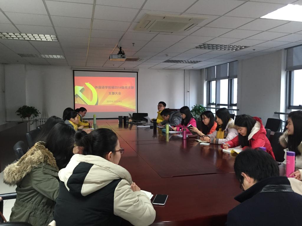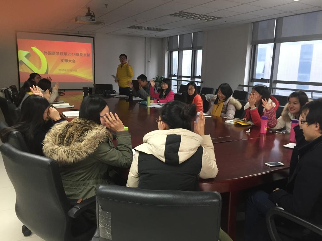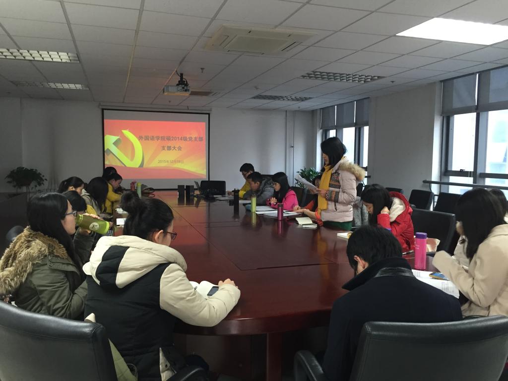 硕2014级党支部于外文楼B912会议室召开支部大会,重点讨论发展对象郝娟娟、张琪珑的党员发展问题。13名正式党员出席大会,会议由支部书记陆天舒主持。