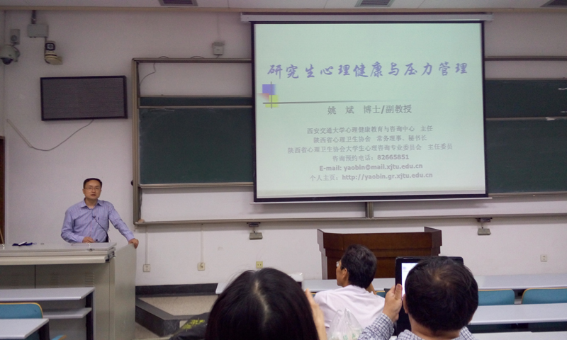姚斌副教授首先向同学们介绍了研究生需要进行心理健康与压力管理的原因,研究生作为一个特殊的群体,来源复杂,年龄不一,班级松散,人际交往浅,婚恋问题多,毕业压力大,科研任务重。调查显示,30%的研究生存在心理问题,但仅有不到10%的学生愿意找心理健康咨询人员。研究生心理健康与压力管理问题需要得到关注。