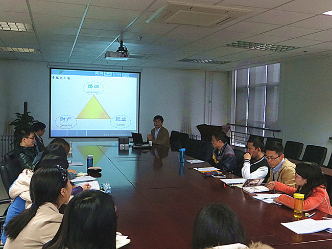 报告会正式开始。张总经理首先以影响人生的“幸福金三角”引入话题,启人思考。他说,人的一生中,婚姻、财产及职业这三要素是幸福的黄金法则。由此话题转入“财产”之中。接着,他又分别向我们详细介绍了财产的概念、要素、财产主题的类型、财产所有人的权利与义务等有关内容。鲜活的例证和生动的语言,不时迎来在场同学阵阵掌声。随后,他通过层层嵌套的演绎模式,引入本次报告的核心议题“知识产权”。他强调,知识产权属于无形财产,其具体又包括专利、商标、版权、专业技术和商业秘密和商誉等几个范畴。