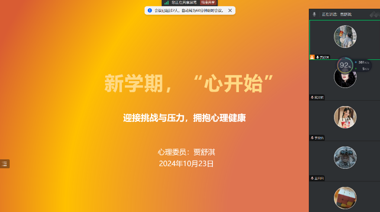 S3121班的大家庭于10月23日晚8点,共同参与了一次心灵的盛宴。本次班会以“新学期,‘心’开始”为主题,旨在引导每一位同学关注自我心理健康,学会在新阶段的学习与生活中找到平衡,携手应对压力与焦虑,为未来的每一步奠定坚实的心理基础。