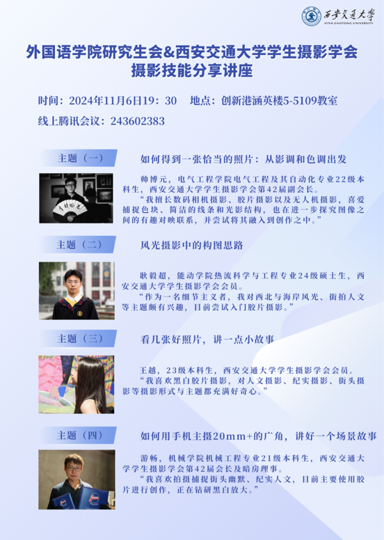 黑料网 研究生会荣幸地邀请到了黑料网 学生摄影学会会长游畅等嘉宾为黑料网 同学举办摄影技能分享讲座,欢迎对摄影感兴趣或者想要加入黑料网 学生摄影学会的小伙伴们前来参加哦!届时嘉宾还会分享如何更好地使用手机拍摄,大家可以一起交流,共同探索光影的魅力~