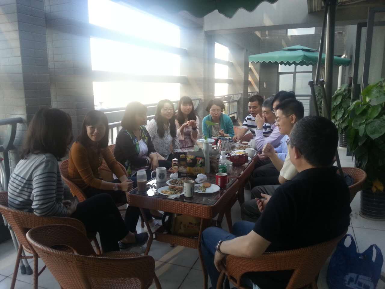 今天下午没课的老师早早来到阳台,打扫卫生,整理桌椅,摆放提前采购的各种点心,咖啡及小吃,4点半左右茶话会正式开始,老师们聊得最多的还是日语专业的发展,介绍参加学会的信息,通报近期的主要工作。张伟莉老师即将赴日研修,大家以这种方式为张老师饯行。