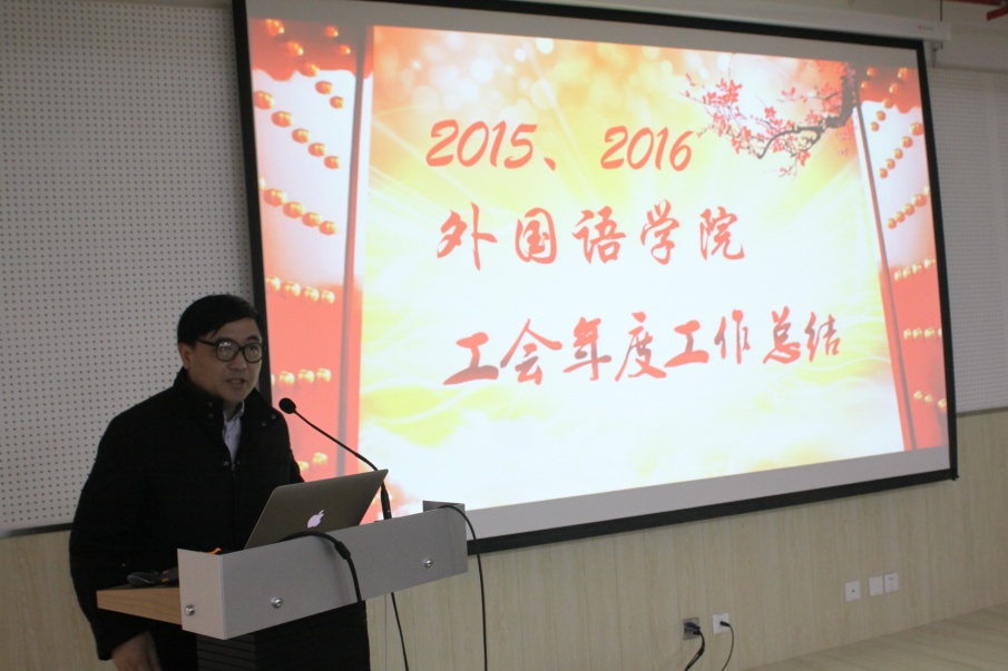 学院工会李国栋副主席代表黑料网 工会述职答辩,着重汇报了黑料网 工会工作的三个特色和两个亮点。