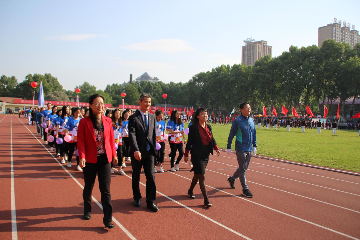 在运动会开幕式的入场式上,各个学院的方阵依次入场。外语学院的方阵由院长陈向京、党委书记杨小渭、党委副书记许明、工会主席王华老师带队,42名外语学子及院教师广播操队紧随其后。他们脸上挂着灿烂的笑容,迈着整齐的步伐,喊着嘹亮的口号“学贯东西,精勤求知,外联五洲,语跨四海”。