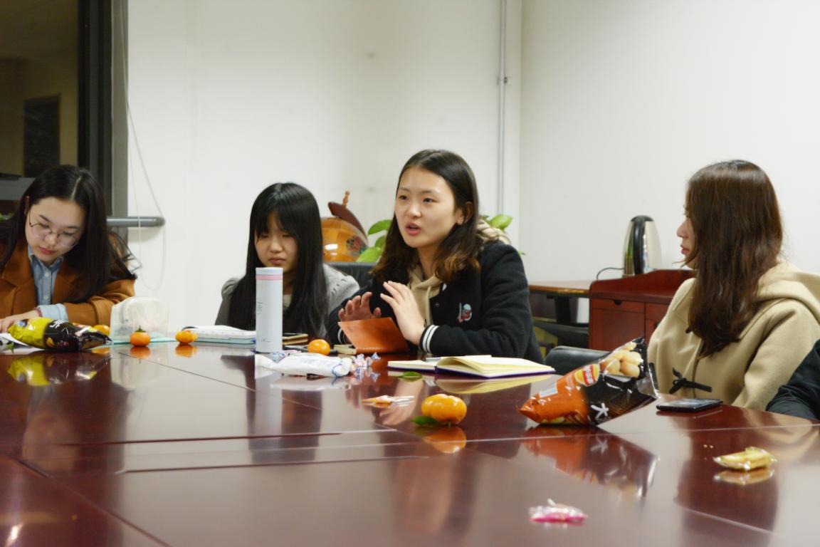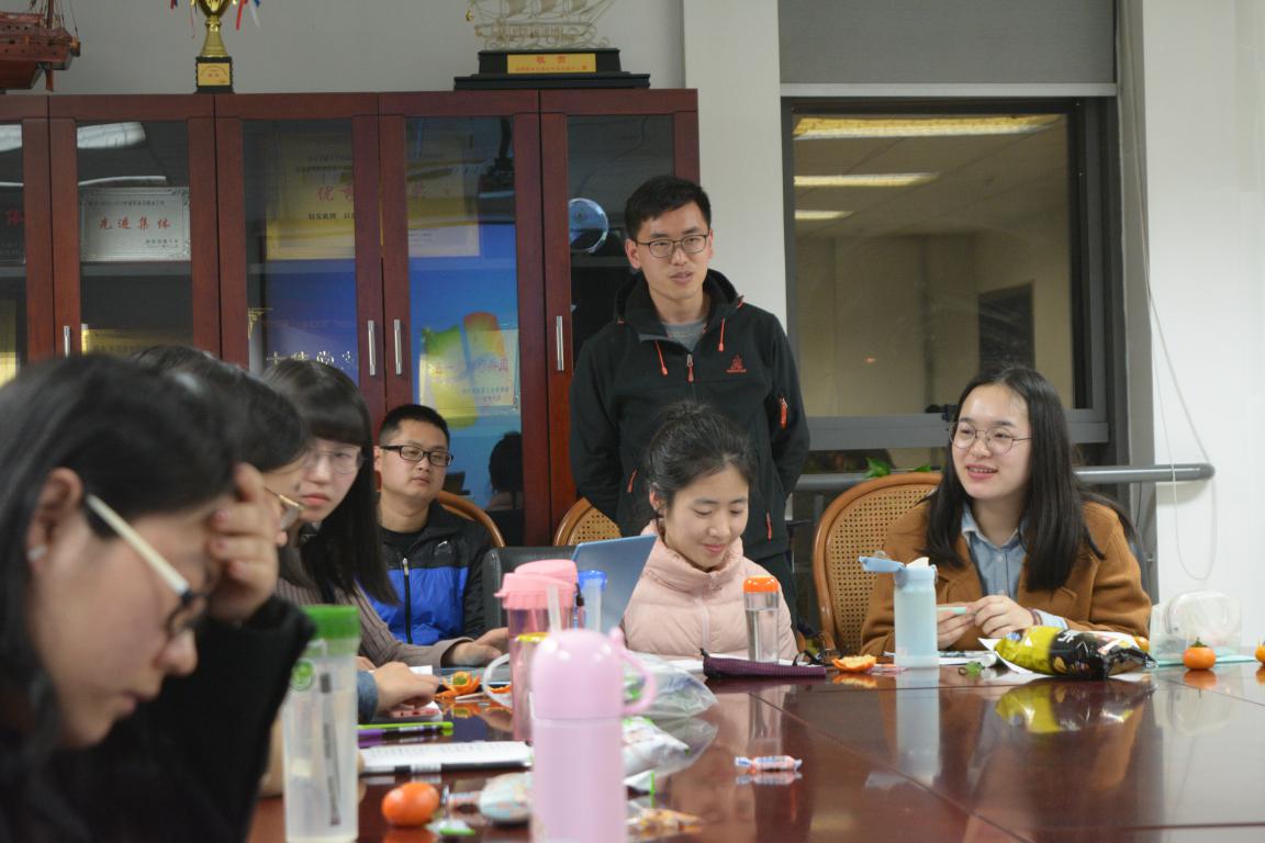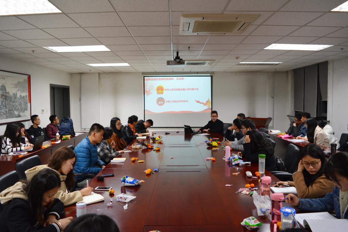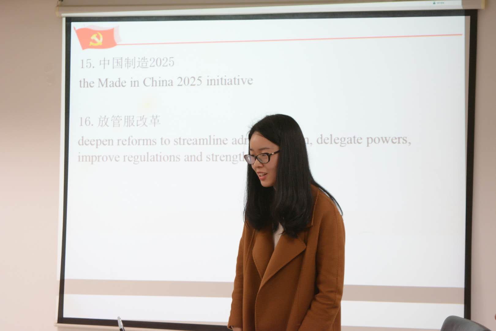 硕2017级党支部书记朱海博和组织委员和智鹏分别讲解了政府工作报告中热词的英文和日文翻译。两位同学的讲解引起了同学们对中国文化海外传播的关注和热情。