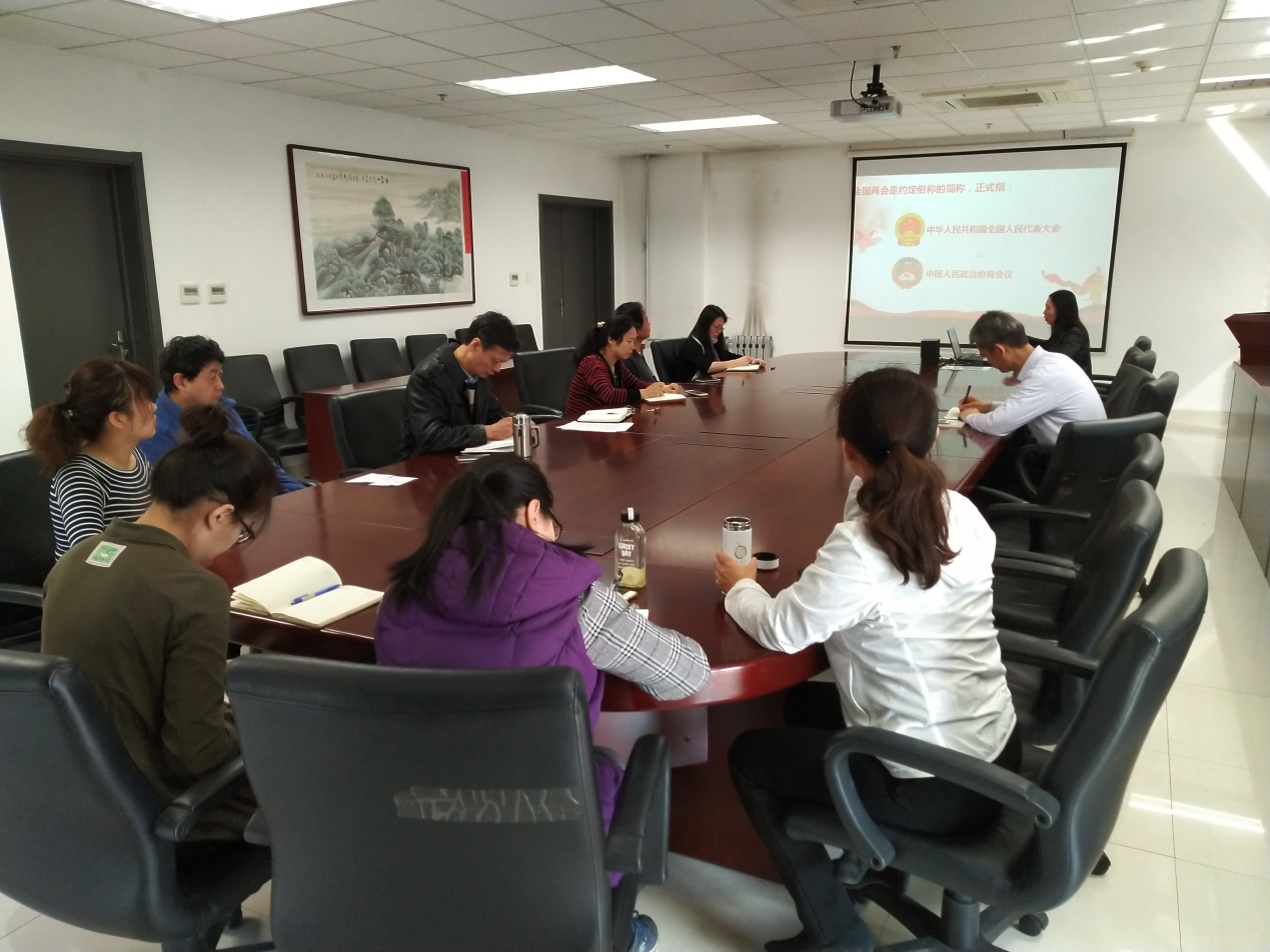 支部书记马薇介绍两会概况及两会热词、新词,解读了李克强总理所做的政府工作报告,用数字描述了中国在经济、政治、民生各个方面取得的巨大成就,并介绍了王树国校长对两会精神的解读,对两会教育相关内容的理解。