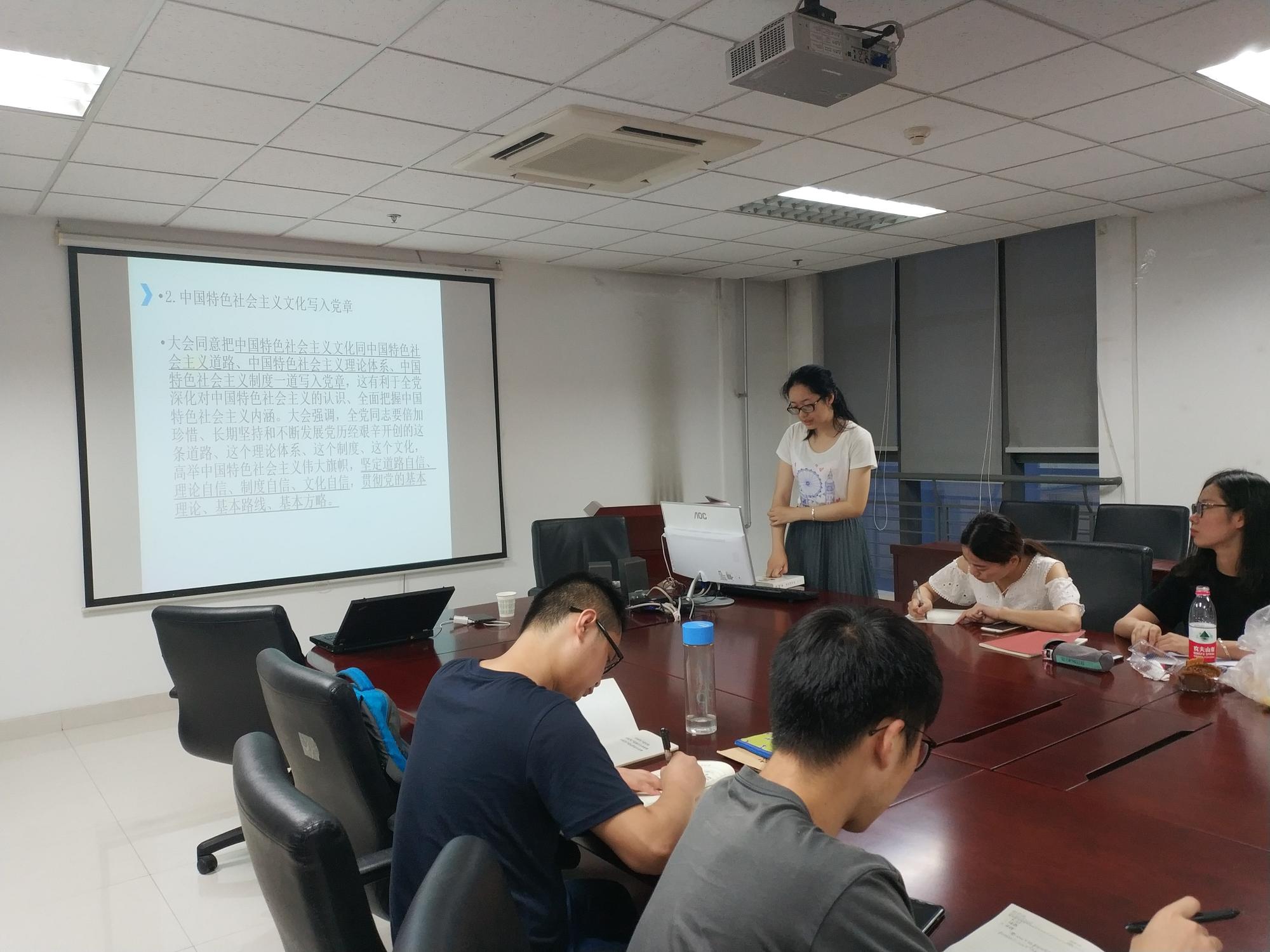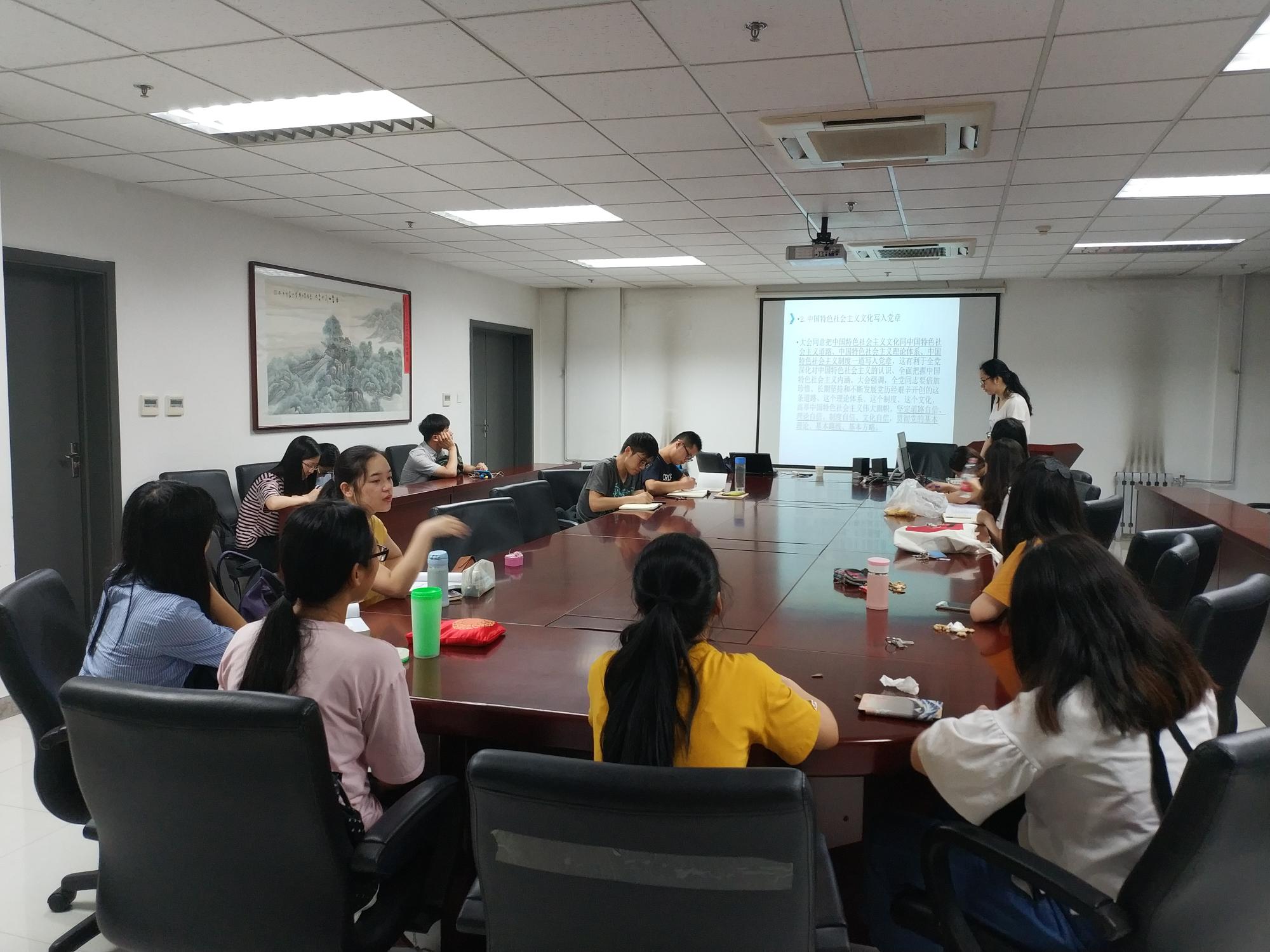 随后,硕2017级党支部书记朱海博带领大家学习《习近平谈治国理政》中的《要有高度的文化自信》这一章节。她提到:“文化是一个国家的灵魂。作为英语专业学生,要讲好中国故事,将中国文化介绍出去。”支部党员和积极分子对文化自信展开热烈地讨论。党员程媛结合自己参加孔子学院培训的经历,她说:“文化是一个民族的灵魂,对中华文化心怀敬畏感,有自信。在推广中华文化过程中,要将中华文化的魅力展现出去。”党员黄欣乐说:“作为翻译专业同学,可以尽自己的力量,帮助中国文学走向西方,完成中国经典作品向西方的翻译和介绍。”积极分子白杨硕说:“游戏“王者荣耀”体现了中国传统文化,有助于发扬中国传统文化。但是我们需要警惕文化产品的制作过程中,对历史和文化经典的折损和误读。”
