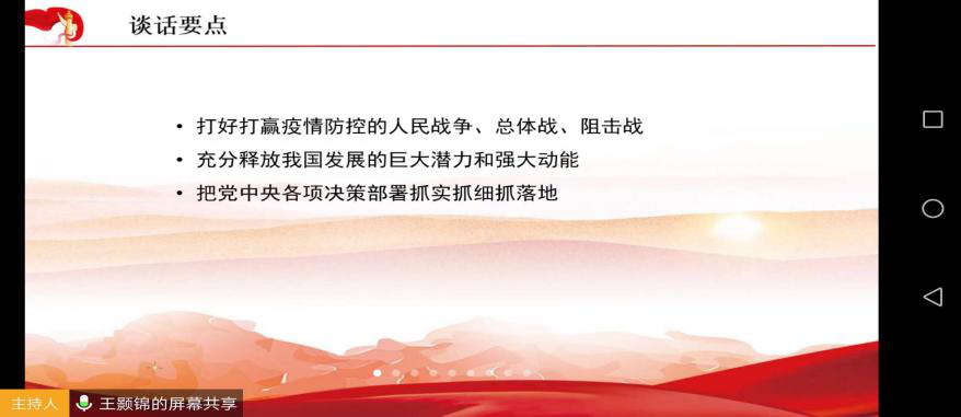 接着,王颢锦同志带领全体党员及积极分子学习了习近平总书记在统筹推进新冠肺炎疫情防控和经济社会发展工作部署会议上的讲话。讲话中指出:我们要打好打赢疫情防控的人民战争、总体战、狙击战,充分释放我国发展的巨大潜力和强大动能,把党中央各项决策表述抓实、抓细、抓落地。