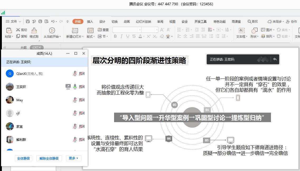 5月20日下午两点半,大学英语基础教研室党支部党员准时在“腾讯会议”上线,参加本月的党组织生活会,会议由支部书记钱希主持。本次组织生活会主要包含三项内容:第一,关于“课程思政”主题规定、内容规定和目标规定的介绍。第二,邀请社会学系副教授(研究员)、陕西省首届创新教学大赛一等奖获得者王奕轩老师给大家做关于课程思政教学的经验分享。第三,支部党员结合自己的大学英语教学谈如何开展课程思政。