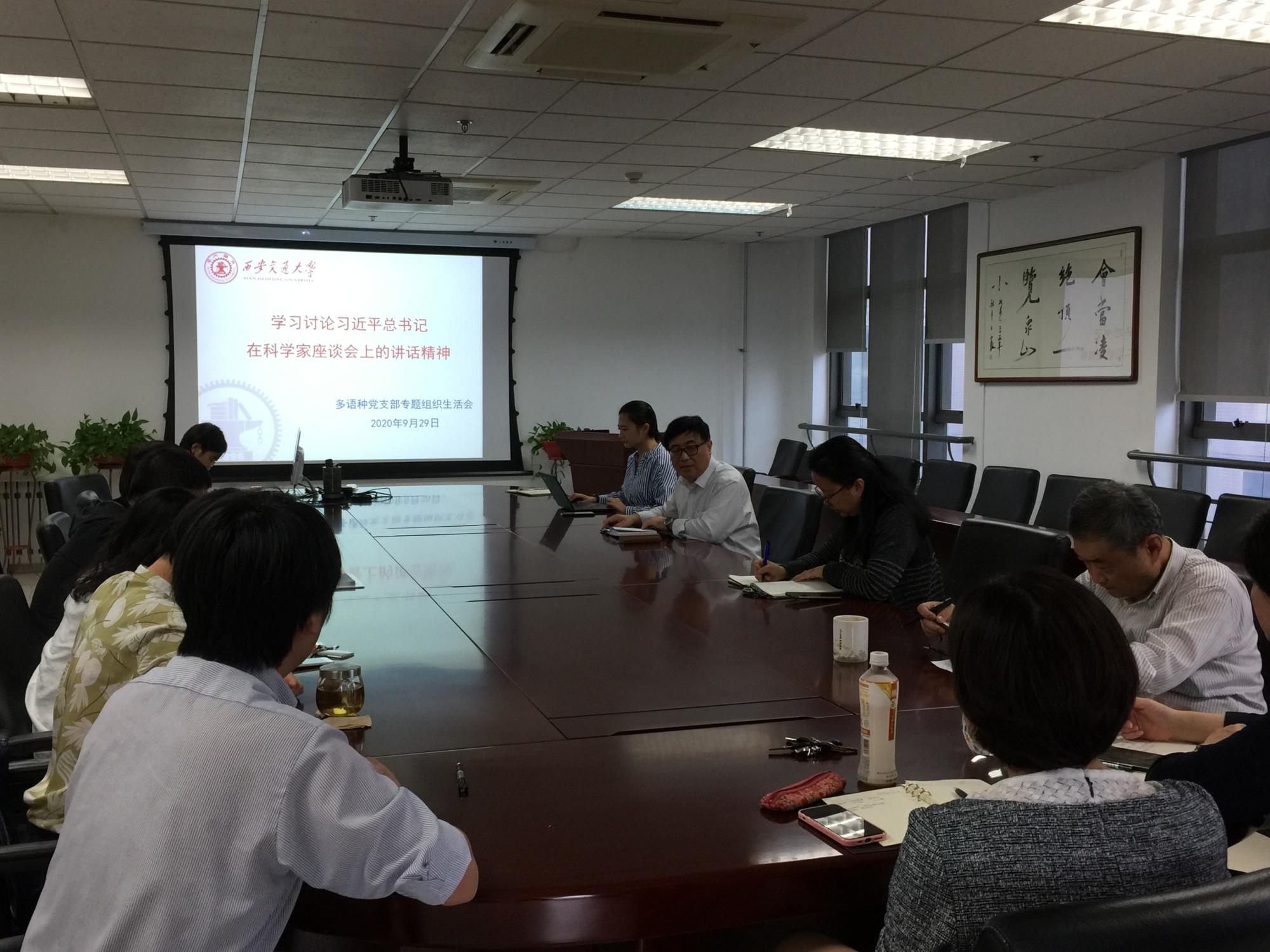 多语种教工党支部在外文楼B912会议室召开专题组织生活会,学习讨论习近平总书记在科学家座谈会上的讲话精神。会议由黑料网
