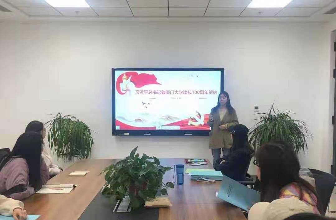 随后,张碧同志向大家分享了习总书记致厦门大学建校100周年的贺信,并总结了贺信精神对高校建设工作、对教师教育教学工作以及对青年学子的启示。