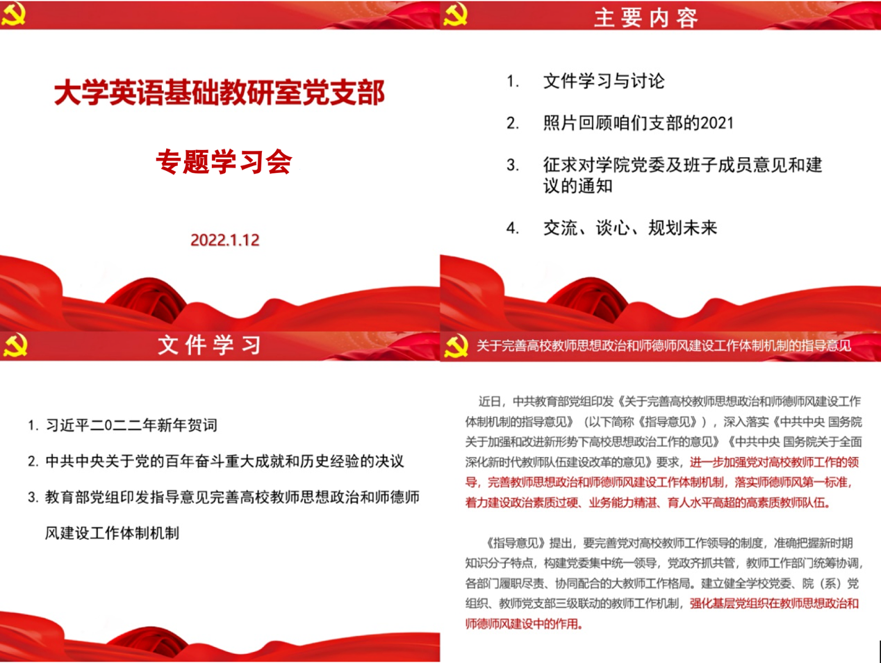 接下来,钱希用图片的形式梳理总结了2021年支部的主要工作。支部在和校内外、院内外开展的各项支部共建活动的同时还结合大学英语教学录制完成了系列英语思政微课,共计16节。思政微课不仅全部上线学校的党建平台,还与中学合作开展了学科思政相结合的实践和研究。
