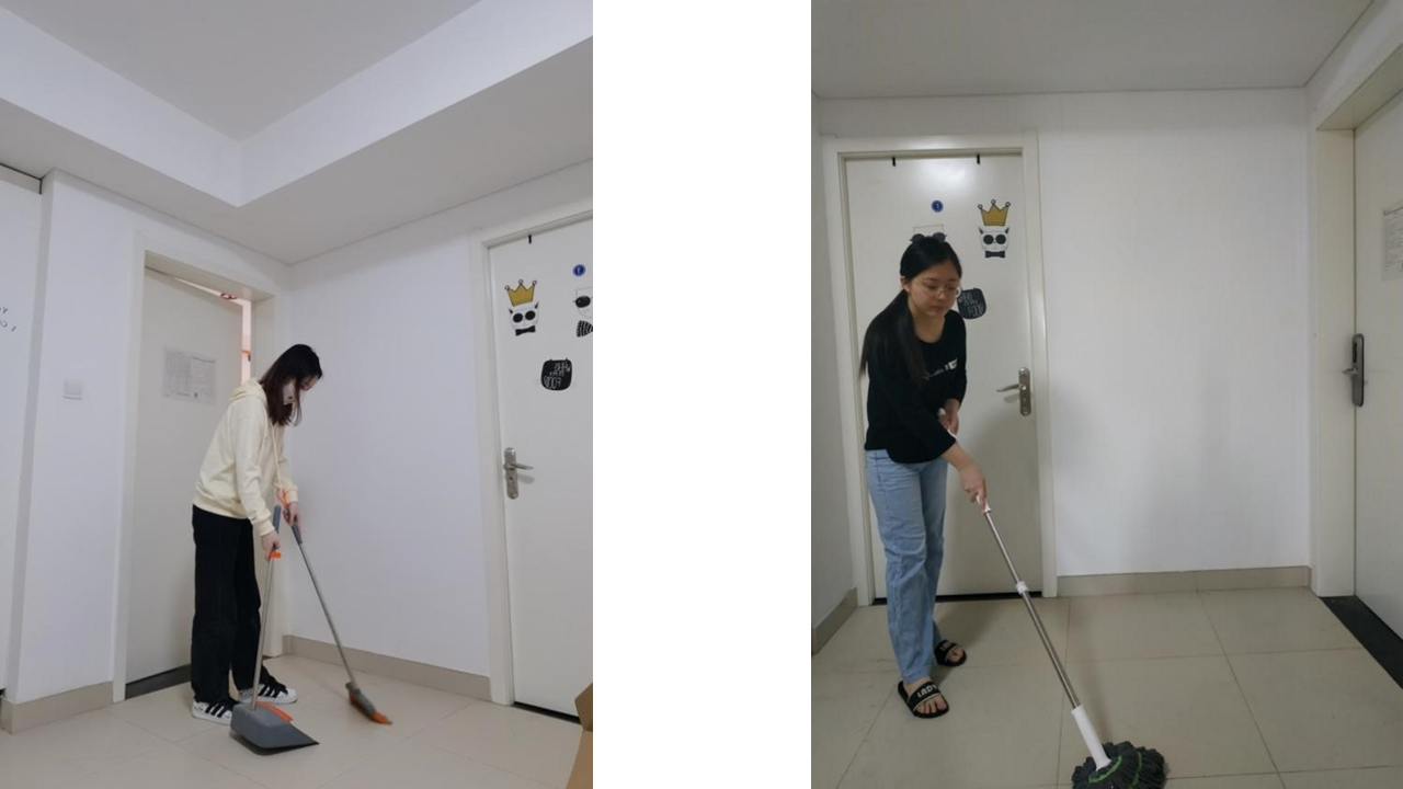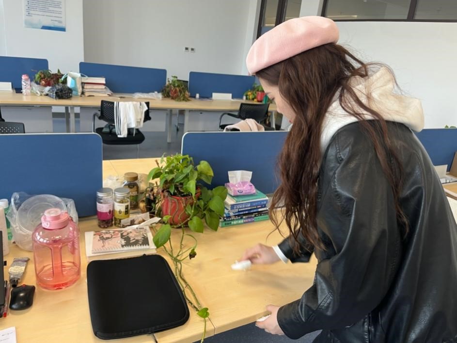 3月4日下午,同学们在涵英楼5楼集合,大家分工协作,手拎拖把、扫帚和垃圾袋认真清理了工位每张桌子上的灰尘和垃圾,清洗并为绿萝浇水。同时,留在寝室的同学也将公共区域打扫得干干净净。在大家的共同努力下,工位和寝室的窗台、过道等区域内的物品摆放整齐,整体环境旧尘除去,焕然一新。