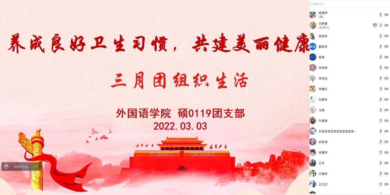 硕0119班团支部以腾讯会议的方式开展以“养成良好卫生习惯,共建美丽健康”为主题的组织生活会,号召同学们积极开展工位和寝室卫生大扫除活动。