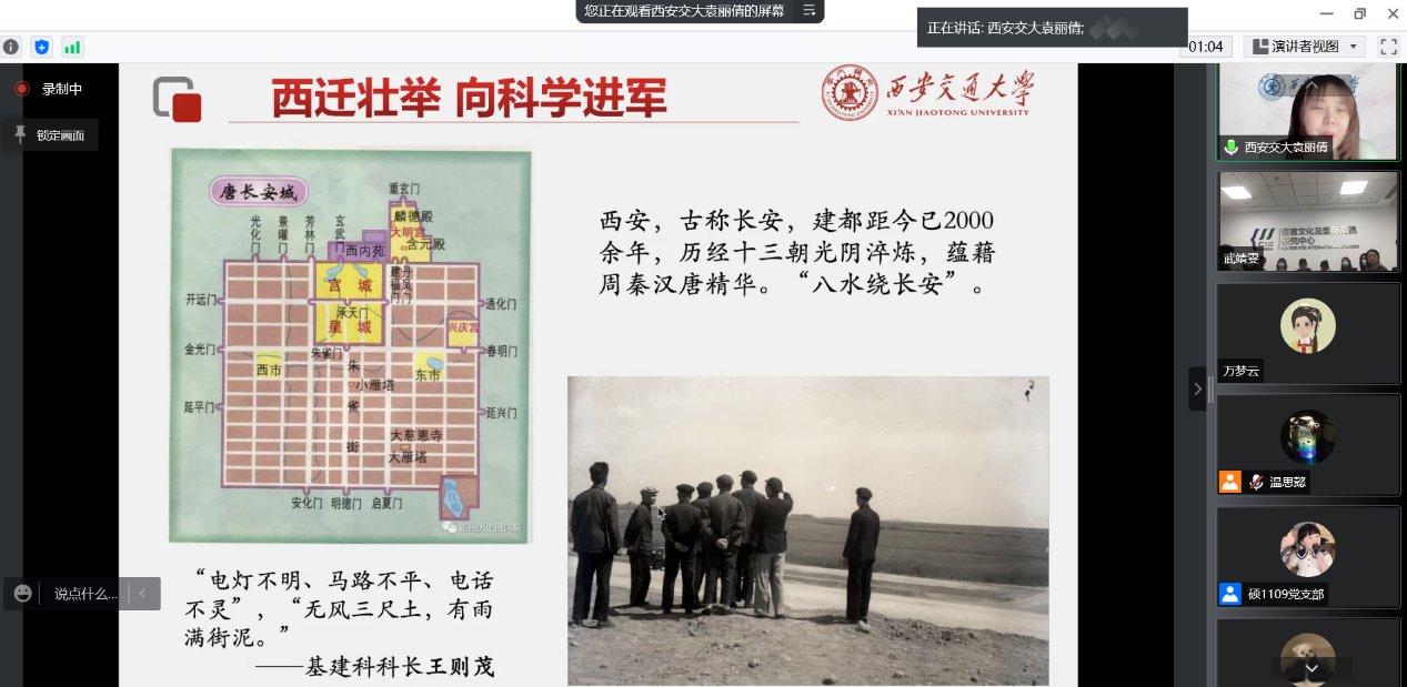 学生微宣讲团成员袁丽倩则为大家带来 “向西,再向西”的主题分享,详细介绍了交大向科学进军的西迁壮举以及其中蕴含的“西迁精神”,鼓励大家向献身大西北建设的西迁老教授们学习,在第四次工业革命的大浪潮中贡献青春力量,肩负起新时代赋予的历史使命。