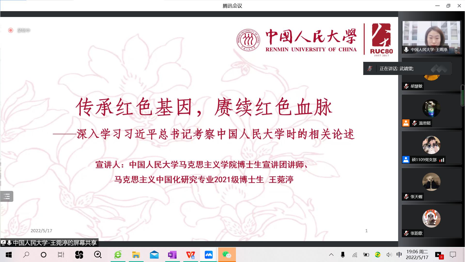 中国人民大学马克思主义学院博士生宣讲团讲师、马克思主义中国化研究专业2021级博士生王菀渟为大家带来以“传承红色基因,赓续红色血脉”为主题的分享,回顾习近平总书记在考察中国人民大学时的讲话,并介绍了中国人民大学诞生于抗日烽火中的陕北公学,具有光荣的革命传统和鲜明的红色基因。