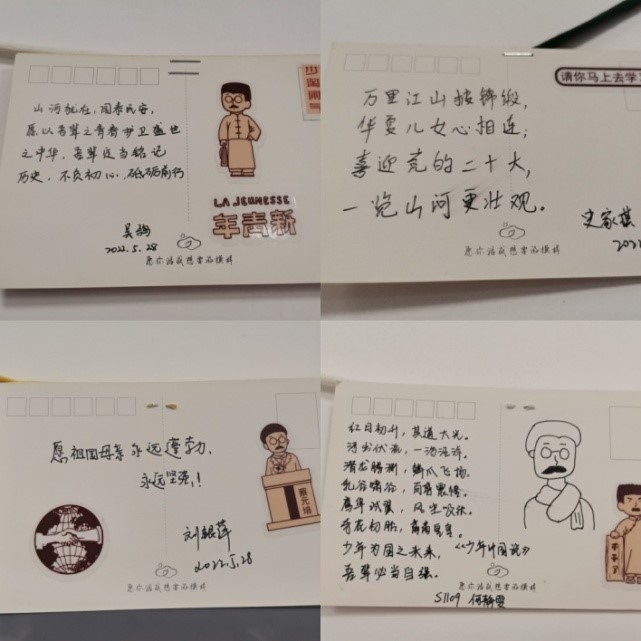 硕1109党支部书记吴鸽写道,“山河犹在,国泰民安,愿以吾辈之青春护卫盛世之中华,吾辈定当铭记历史,不忘初心,砥砺前行”。硕0119党支部书记刘银萍用“愿祖国母亲永远蓬勃,永远坚强”的话语表达了内心最真挚的祝福。洪霞在明信片上写下“忠于祖国,忠于人民,立鸿鹄志,做奋斗者,求真学问,练就本领。喜迎二十大,推动国家进步,民族复兴!”入党积极分子黄茜写下“祖国之树屹立不倒,祖国之花永不凋谢,祖国之水万古长流”!简单质朴的话语中流露着每一位同志的真心与祝福。随后,大家一起将明信片在自习室悬挂起来,以提醒同学们不忘初心,踔厉奋斗。