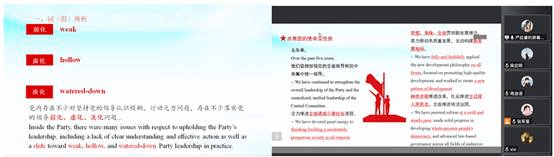 张军星介绍本次会议主题和意义,分享学习心得,重点介绍二十大报告新表述及其译法,强调大家牢记固定表达。牛子琨从词组辨析、特色短语以及金句学习三个方面为大家带来精彩的讲解,对党的领导弱化、党员干部教育管理虚化、党员意识淡化三个概念进行了生动形象的辨析。