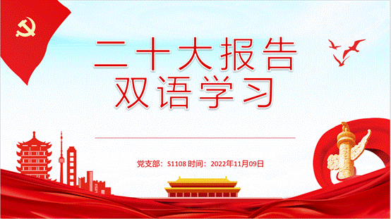 硕1108班党支部结合专业特色,学习党的二十大报告双语版。本次学习共分为两期,第一期由支部党员张军星、牛子琨、梁启明、严廷睿分享学习感悟。支部党员、入党积极分子、团员及群众共同参加此次学习,会议由党支部书记张军星主持。