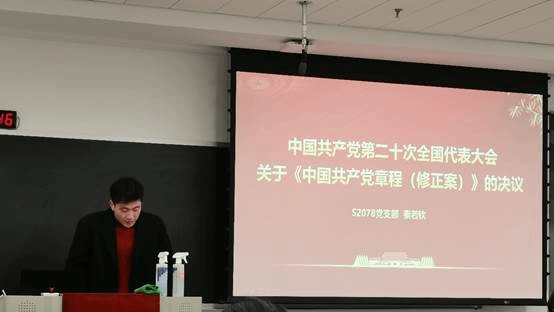 电气学院纪凯龙通过播放视频领学中国共产党章程,并表示“雄关漫道真如铁,而今迈步从头越”,我们要总结经验,不忘初心,坚持党的领导,继续奋斗,取得更大的成功!
