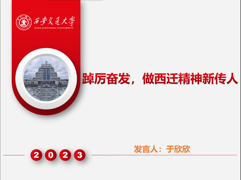 硕2118党支书于欣欣作题为“踔厉奋发,做西迁精神新传人”发言,她回顾了西迁历史,重温西迁精神,于欣欣提到,我们作为新时代的中国青年、西迁精神的传承人,担当民族复兴大任的火把已然传到我们面前。弘扬西迁精神,是我们的责任和使命。真正做到将西迁精神融入骨血、纳入日常。