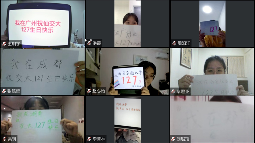 硕1109党支部线上参与的同学分别在纸上写下了“我在XXX祝交大127生日快乐”的字样,在祖国的大江南北共同献上对学校的祝福。虽然大家因为学习实习等散作满天星,但对学校的祝福和爱却时刻能聚作一团火。