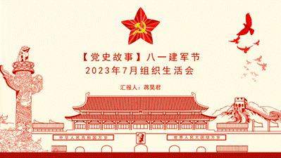 会议的第二部分,蒋昊君同志围绕八一建军节展开了党史故事分享。蒋昊君同志从八一建军节的由来出发,讲述了南昌起义这一著名党史故事,然后介绍了八一建军节的确立过程,最后结合习近平总书记讲话的重要精神,介绍了军事强国的理念。在八一建军节即将来临之际,英语一组全体成员通过党史故事分享这一环节,表达了对中国人民解放军的崇高敬意。