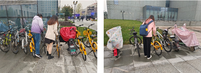 因为教学楼和宿舍区有一定距离,同学们在时间紧迫时会选择骑共享单车。但是骑到停车区锁车后,就一走了之。单车歪歪扭扭,随意停放。团支部成员们扶起被风吹倒的单车,并摆放整齐。通过这次活动,成员们都意识到以后要注意爱护公共用品,珍爱公共资源。