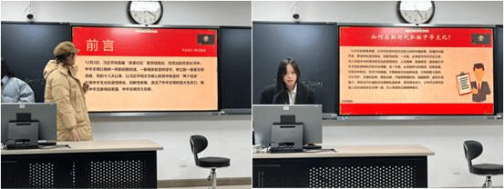 会议伊始,王一璇同学和王若熹同学对习语“推动中华文化更好走向世界”相关内容进行汇报。王一璇同学具体阐述了中华文明的特征和弘扬中华文化的意义,强调习近平总书记在党的二十大报告中提出的:坚守中华文化立场,提炼展示中华文明的精神标识和文化精髓,加快构建中国话语和中国叙事体系,讲好中国故事、传播好中国声音,展现可信、可爱、可敬的中国形象。这为开展文化传播工作,提高国家文化形象,提升中华文明的传播影响力,提供了根本遵循与战略指引,是世界文明演进中,中华文化助推提升中国国家实力与国际地位的重要方式和途径。接着王若熹同学分享了如何在新时代弘扬中华文化这个板块,她说到:只有既新火相传、代代守护,又顺时应势、推陈出新,才能把跨越时空、超越国界、富有永恒魅力、具有当代价值的文化精神弘扬起来,激活其生命力,让中华文明同各国人民创造的多彩文明一道,为人类提供正确精神指引。