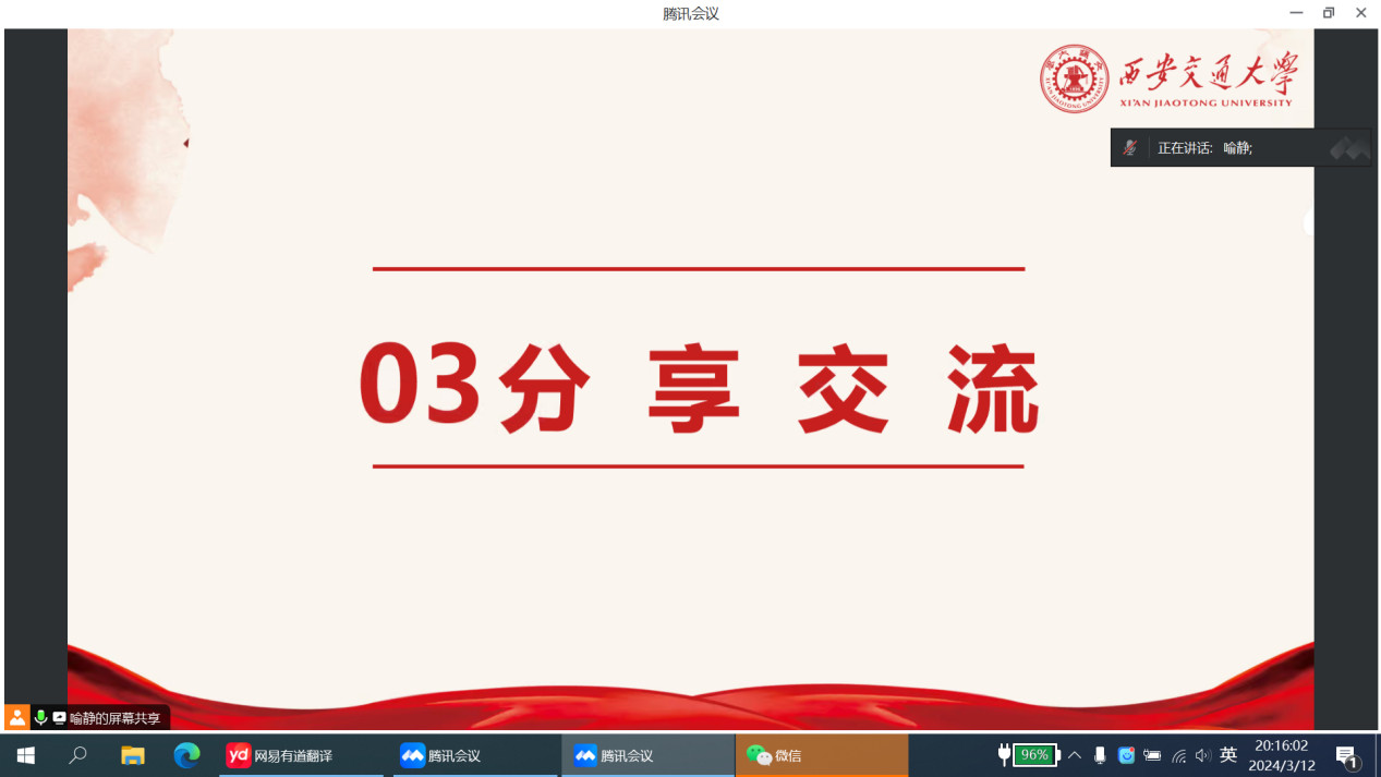 接下来,支部书记喻静带领支部成员进行理论学习,筑牢思想根基,共同学习了2024年政府工作报告、2024年政府工作十大任务以及李强总理调研交大创新港的相关内容。2024年是中华人民共和国成立75周年,是实现“十四五”规划目标任务的关键一年。2024年政府工作报告中强调,今年我国发展面临的环境仍是战略机遇和风险挑战并存,有利条件强于不利因素。我们必须增强信心和底气。同时要坚持底线思维,做好应对各种风险挑战的充分准备。只要我们贯彻落实好党中央决策部署,紧紧抓住有利时机,用好有利条件,把各方面干事创业的积极性充分调动起来,一定能战胜困难挑战,推动经济持续向好,行稳致远。作为青年大学生,我们应不断提升自身的知识水平和实践能力,注重培养自己的创新意识和创业精神,为实现中华民族伟大复兴的中国梦贡献自己的力量。