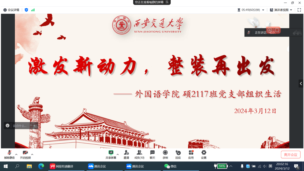 硕2117班党支部线上召开“激发新动力,整装再出发”主题组织生活。会议由硕2117班党支部书记喻静主持,支部全体党员参会。