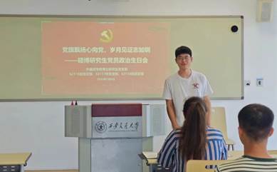 博士研究生党员史晓婷同志表示,“在这个充满意义的日子里,组织为我们举办政治生日会,我深感荣幸,心中无比激动。这不仅是对我个人政治身份的一次庄严确认,更是对我党忠诚与信仰的一次深刻洗礼。在党旗的引领下,我将不断学习,提升自我,用实际行动践行党的宗旨,服务同学,贡献社会。”