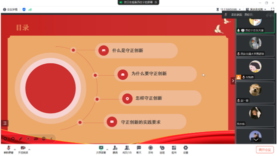 活动伊始,苏佳宁播放了一则来自12月1日新闻联播的视频片段,视频介绍了“守正创新”的核心内容。视频中提到,“守正创新”是习近平总书记在《求是》杂志第23期文章《必须坚持守正创新》中提出的重要思想方法,强调守正才能保持方向不偏,创新才能引领发展,推动时代进步。文章指出,守正创新是新时代治国理政的重要思想方法,是中国式现代化探索的重要原则。实践中,既要坚持中国特色社会主义的本质要求,确保正确方向,又要把创新摆在突出位置,推动各方面的创新,确保改革突破性进展。通过观看视频,大家对“守正创新”有了更直观的理解,为后续的学习奠定了基础。