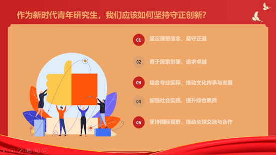 随后,苏佳宁同学将理论学习回归到实践,提出了新时代青年研究生应当如何践行“守正创新”。她总结介绍了五条准则: