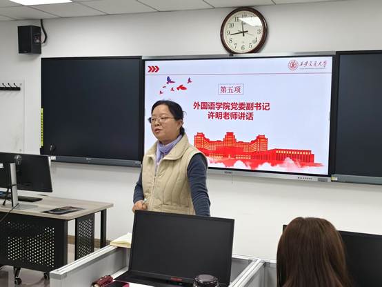 党委副书记许明老师对本次组织生活会给予了高度评价,认为会议成功且富有深度,充分体现了党支部的优良传统。许老师指出,学习分享环节中,民营经济座谈和哪吒案例激励了年轻党员突破思维边界,勇于创新,敢于接受时代的挑战。她强调,作为新时代的党员,必须紧密结合国家发展战略,树立远大志向,勇于开辟更广阔的职业发展空间。许老师鼓励外国语专业的学生要更多关注国家政策和行业动向,结合专业发展,提升自己对国家发展战略的理解和应用能力。同时,许老师提出,党支部应进一步丰富活动形式和内容,扩大校内外影响力,并要求党员增强组织纪律性,按时参加各项活动,确保党性修养的持续提升。