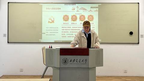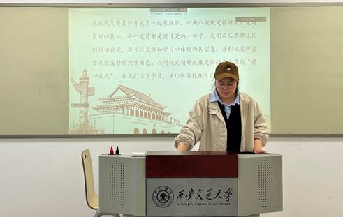 会议最后,王田田通过几道简单的知识问答帮助支部成员巩固了中央八项规定精神的内容,支部同学积极参与。通过知识问答,大家对中央八项规定及中央八项规定精神有了更加深入的了解,深刻体会到了应牢记中央八项规定,不违反中央八项规定精神。