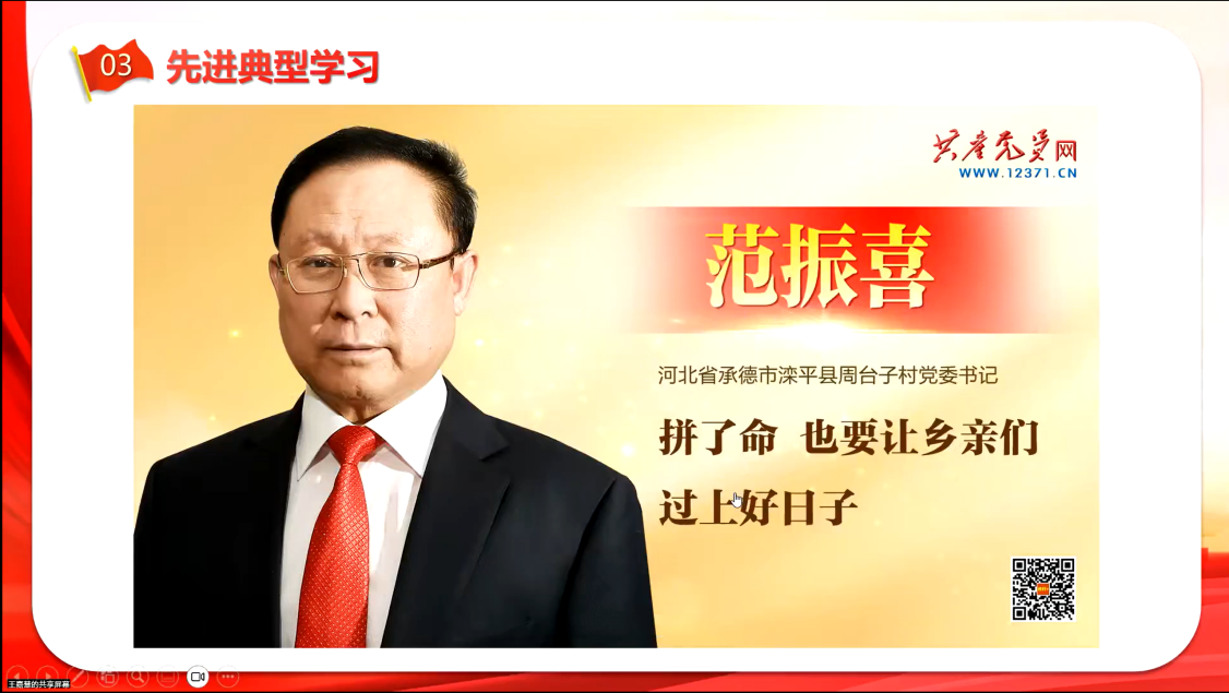 会议第三部分聚焦先进典型学习。全体参会人员一同观看了《榜样9》专题片,深入学习“铁人村支书”范振喜同志的先进事迹。他带领群众脱贫致富,让周台子村从“贫困村”蝶变为“幸福村”,以实际行动诠释了一名共产党员“不负群众、不负组织”的初心使命。党员们纷纷表示,要以榜样为镜,在未来步入职场后要立足岗位履职尽责,把优良作风体现在实际行动中。